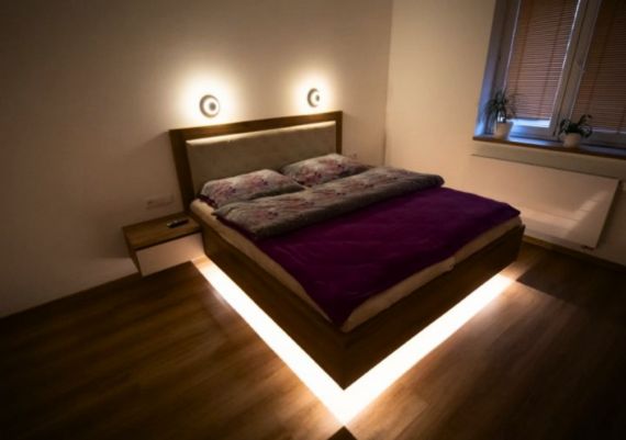 Chtěli jsme postel, která bude dobře vypadat a zároveň se bude snadno udržovat. Pod postelí je volno, prach se tam nezadržuje a ložnice se udržuje čistá. LED podsvícení je nenápadné, ale moc příjemné – hlavně večer.
